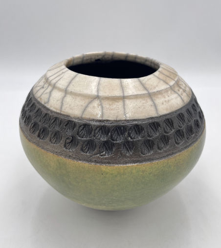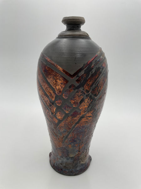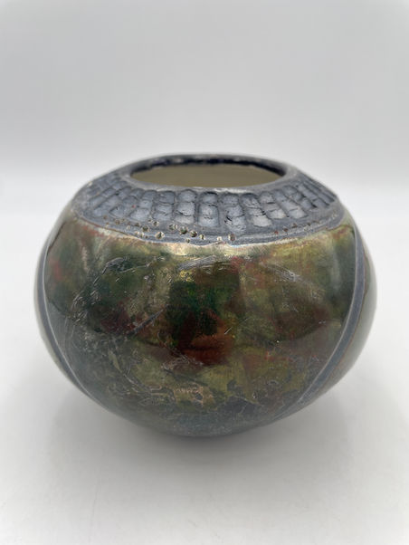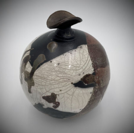 Raku is a Japanese ceramic firing process that uses the elements of earth, fire, air, and water to create decorative pottery. Hot pieces are removed from a low-temperature kiln and placed into combustible materials, such as newspaper or sawdust, which ignite. The resulting carbon-rich atmosphere creates unique metallic lusters, smoky effects, and spontaneous flame patterns on the glaze. The process yields porous, weak, and crazed (cracked) pieces that are unsuitable for functional items, such as food or drink containers, but are prized for their unpredictable beauty and decorative value.